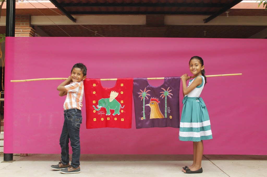 In the case of elephants, attitudes pro and con became part of a virtual Facebook conversation that followed on Soid’s venture into creating trajes with his designs, including his signature flying elephant. Many Juchitecos rushed to buy his t-shirts, coffee mugs, and iPhone holders while some remained skeptical of traje with elephants and flying fish. Traje has always had flowers, some said. Soid responded on FB with photos of young attractive Juchitecas sporting trajes with his designs; two adorable children carrying a pole between them with two traje blouses, one with an elephant, the other with a rooster; images of a blouse in progress–again with an elephant. He slipped into the conversation an old black and white photo of an Isthmus traje with a distinctly non-floral, geometric panel design. The back and forth continued and Soid posted a photo of himself lounging in a patio chair with a photo-shopped large, handsome elephant head. Then came a post with a photo of a masterfully embroidered traje with flowers—a product of his shop, and a caption that read, “For those who do not like elephants.”