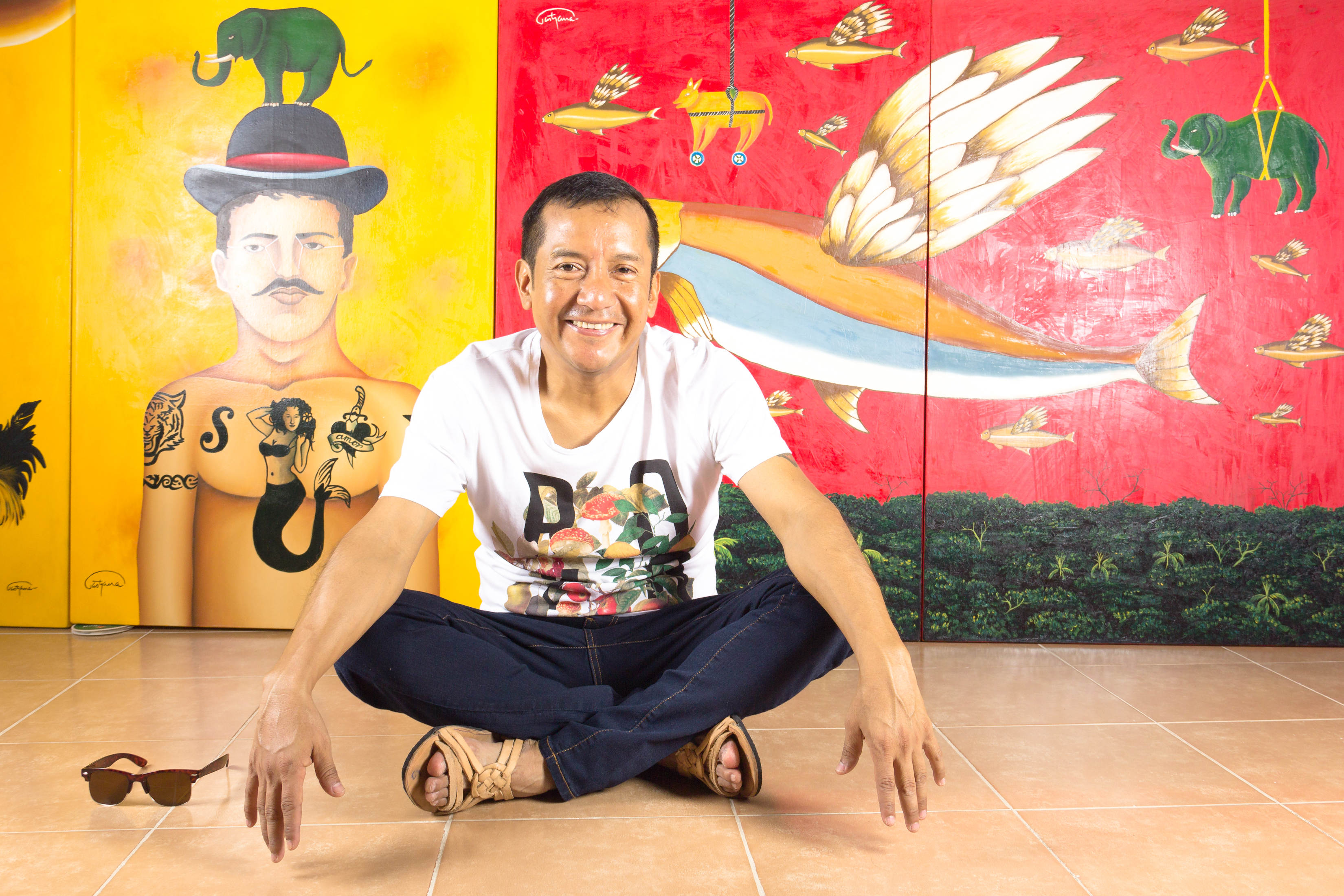 Soid spoke only Zapotec until he went to school where he showed a talent for drawing. He went to the School of Design of the Institute of Fine Arts in Mexico, D.F. and has had more than eighty exhibitions throughout Mexico and in the United States, Cuba and Indonesia. After Indonesia, elephants joined his zoological garden of peculiarly Isthmus creatures—fish, roosters, dogs, armadillo, water birds, most of which, including the elephants, appear fully winged and floating among palm trees, men flying on fish or sometimes elephants, the occasional Corona beer logo or a 1950’s style low-rider southern California car, lotus and frangipani blossoms, Juchitecas wearing traje [matching blouse and gathered skirt] and the big, white lace headdress, and the occasional semi-nude woman with tattoos. His work–lithographs, paintings, posters, party invitations, and book jackets — stuns the eye with its vibrant colors, the colors that define Juchitán. Its fantastiscal scenes impeccably executed are also characteristic of Juchitán art since the great Rufino Tamayo and Francisco Toledo.