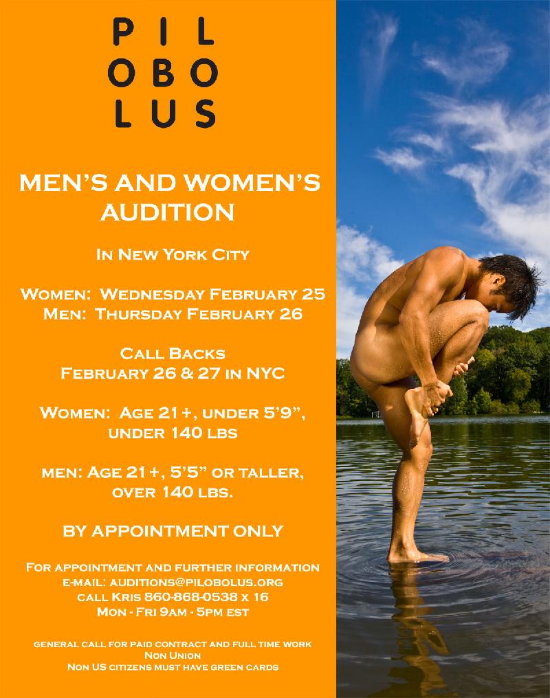 The Pilobolus touring company—known as P7, is small—seven dancers and a minimal technical staff. The dancers are in charge of virtually everything while on the road though they maintain contact with the administrative staff and artistic directors back home. Dancers stay with the touring company anywhere from two to nine years, with five or six being the norm. When dancers leave, they have to be replaced and, again, Pilobolus charts its own course. It does not have a school which, like other companies, can be a feeder. It does not have its own recognized technique which is another way of choosing dancers. So what does the audition process involve? Auditions are by appointment only. The first call is two days, one day for women, one day for men. They will usually get 200 to 300 dancers for one or two positions. There are then two days of call-backs when the numbers have been winnowed down to perhaps a dozen at the most. What are the hopeful dancers asked to do? Run—the prolific minds and bodies of Pilobolus directors and dancers have invented dozens of running exercises that rather quickly separate dancers who may be possibles from those who are not. When you have 200 people in one studio all running, it takes a real kinesthetic awareness to run smoothly without bumping into anyone. They are asked to run slow, run fast, run low to the floor or high on the balls of their feet. And then they are asked to flock, following a leader and changing leaders. Starlings do this really well, hence the phrase “murmuration of starlings” to describe the beautiful wheeling actions of large flocks of birds. Humans are not naturally good flockers and in these auditions, they do not have the help of aural cues which seem to be part of bird behavior. What seems to distinguish a good human flocker is a refined kinesthetic sense of her own body in relationship to all the bodies around her. Jumping is then added to running, and, finally, individual dancers do short improvisations and some partnering work.