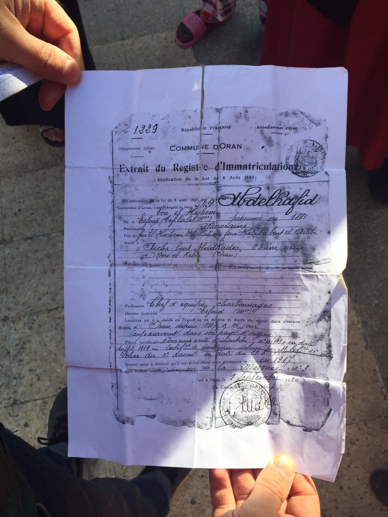 A man holds a photocopy of a French identity card from the colonial era. He uses its mediality to prove his family had been in a decayed building for nearly a century—photo by author.