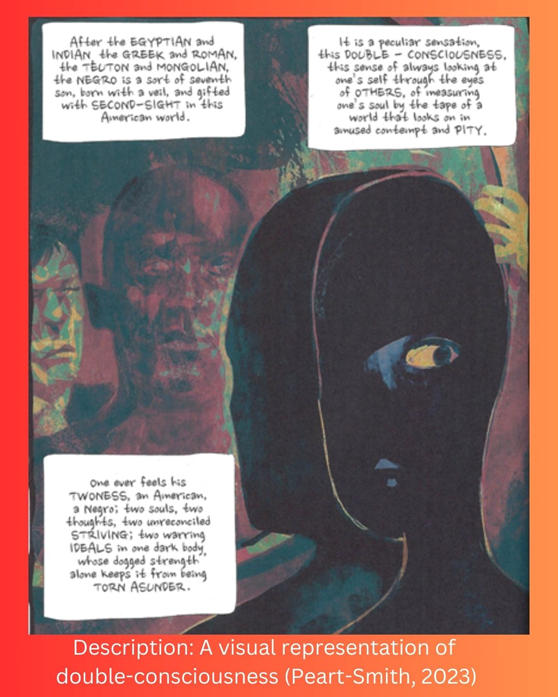 Here, I’d like to refer to what W.E.B. Du Bois (1903) has said about growing up under these kinds of conditions and the kind of racial hyper-consciousness it can produce—or, what he called a “double-consciousness.” To simplify, it’s the idea that if you are a racialized person, you will learn to always look over your shoulder for the pair of white eyes judging your every single move—that is, white society is always watching, always reminding you that you are first and foremost a racialized subject. Eventually, living under a racial microscope can have an effect on individuals: you might start behaving certain ways in front of certain people. Those behaviors might feel faked or inauthentic, almost as if developing a second-version of yourself—necessitating a feeling of twoness, a reality split by a racial color-line.